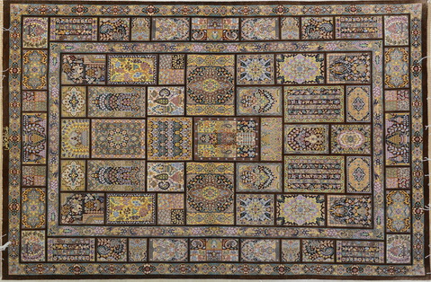تمام ابریشم نفیس اندازه : 160 * 110 جنس تار و پود (چله): ابریشم رنگ بوم : رنگ غالب قهوه ای رنگ حاشیه : رنگ غالب قهوه ای جنس پرز : ابریشم خانه شمار : 52 طرح نقشه : چهل تکه کد محصول: انتشار